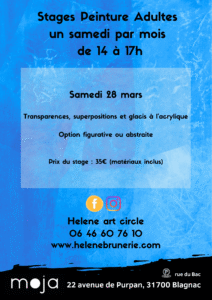 – à partir d’une technique particulière ou d’un thème, donnés comme point de départ. Des options (figuratives ou abstraites) et un suivi personnalisé sont proposés, afin que chacun puisse réaliser son projet personnel au cours du stage. Il s’git donc de sessions plus expérimentales !
